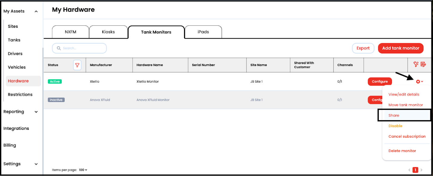 - Click Configure to select your Tank Monitor and connect it to a Tank. If clicking Configure from the Hardware page, you will be taken to the Site Detail page to configure your Tank Monitor.